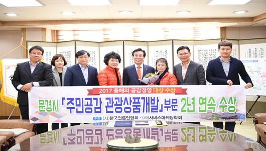 [문경=경북IT뉴스] 문경시는 10월 27일 서울조선호텔에서 개최된 2017 올해의 공감경영 대상 시상식에서 2년 연속 ‘주민공감 관광상품개발’부문 대상을 수상했다. 올해의 공감경영 대상은 (사)한국언론인협회, (사)서비스마케팅학회에서 공동 주최하고 한국지속경영평가원이 주관하는 행사로 고객을 진심으로 섬겨 지역사회와 국가의 행복에 초석이 되는 CEO, 브랜드, 지자체를 선별 시상한다.