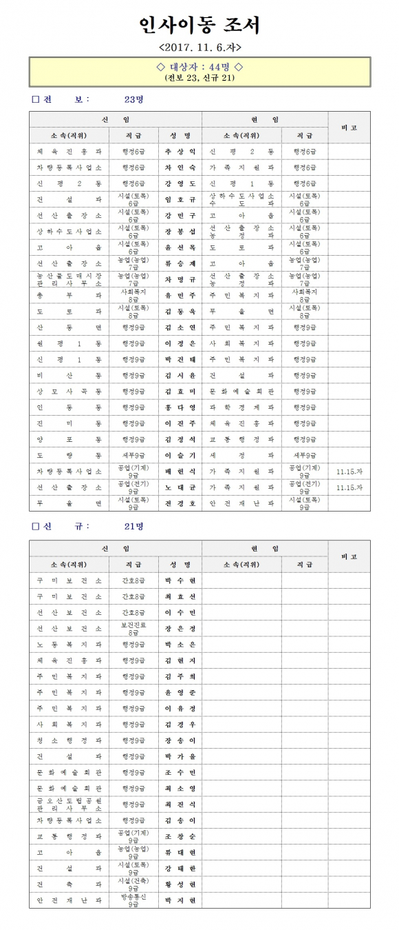대상자는 44명(전보 23명, 신규 21명)이다.