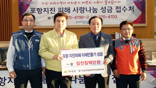 [의성=경북IT뉴스] 의성군과 의성군청공무원직장협의회는 “18일 오후 포항시재난안전대책본부에 지진피해 복구를 위한 긴급 구호성금 1,700만원을 전달했다”고 밝혔다.