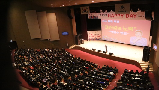 ‘2017 LG수험생 Happy Day’는 경운대학교 벽강아트홀에서 구미관내 5개교(경구고,구미여고,금오여고,현일고,북삼고) 고 3수험생 1,700명을 대상으로 명사초청 특강, 사제공감 미션릴레이, 참가학교 장기자랑, 초청공연 등 다채로운 프로그램으로 진행됐다.