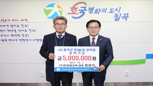 [칠곡=경북IT뉴스] 지난 12월 1일 칠곡군은 호이장학금 기탁식을 가졌다. 이날 관내 2곳의 업체에서 지역인재육성과 교육발전을위해 써달라며, 벽산엔지니어링(주) 김동운 대표가 500만원, ㈜한양에코텍 최창식 대표가 500만원을 기탁했다.