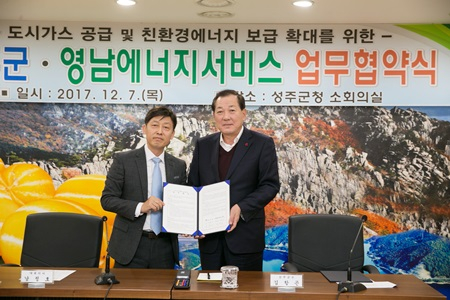 [성주=경북IT뉴스] 성주군은 12월 7일 군청 소회의실에서 영남에너지서비스와 도시가스 공급 및 친환경에너지 보급 확대를 위한 업무협약을 체결했다.