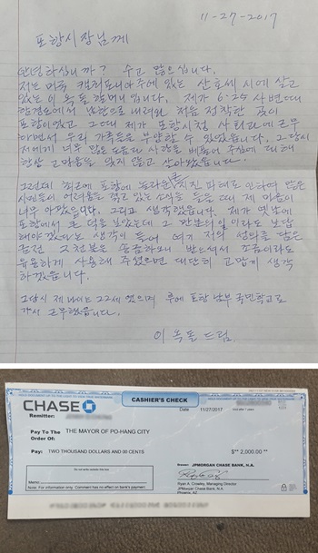그러던 중 최근 발생한 큰 지진에 포항시민들이 어려움을 겪고 있다는 소식을 듣고 너무 마음이 아팠다며, 과거 포항에서 받은 도움에 보답하고자 2천불을 보내니 유용하게 사용해 달라며 편지를 마쳤다.