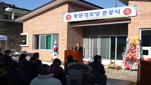 신축된 동문경로당은 총 사업비 1억5천만원을 투입해 건축면적 99㎡의 규모로 건립됐다. 이날 준공식 행사는 경과보고와 함께 경로당 건립에 도움을 준 인사들에 대해 감사패를 전달하고, 경로당 회원들과 마을주민들이 정성껏 준비한 다과와 오찬을 즐기는 것으로 진행됐다.