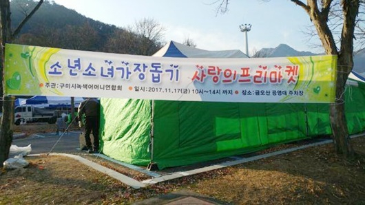 녹색어머니회는 지난 11월 17일 금오산 대주차장에서 열린 소년소녀가장 돕기 사랑의 프리마켓 행사에서 회원들이 기부한 물건과 차와 음료,떡볶이, 어묵 등을 판매한 수익금 일백만원을 기부했다.