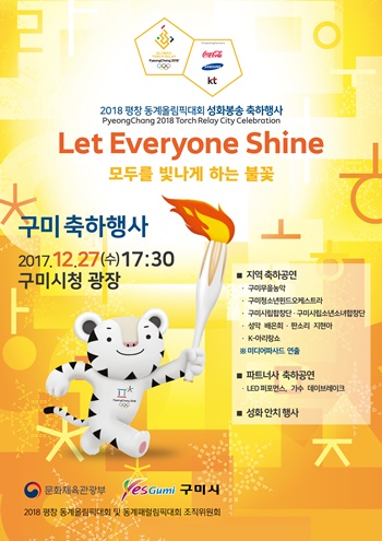 [구미=경북IT뉴스] 2018년 평창 동계올림픽 대회의 성공적인 개최와 성화봉송을 축하하기 위해 구미시는 12월 27일 오후 5시 30분부터 구미시청 광장에서 성화봉송 지역축하행사를 개최한다.
