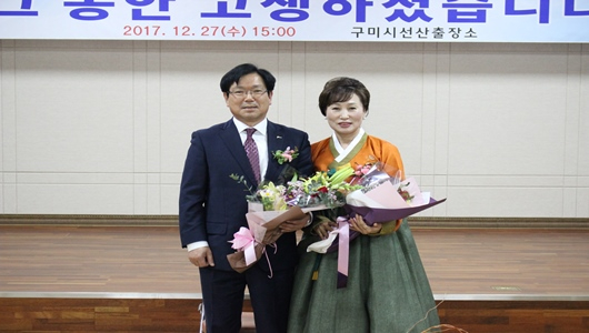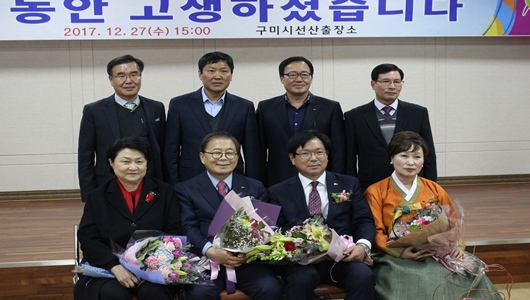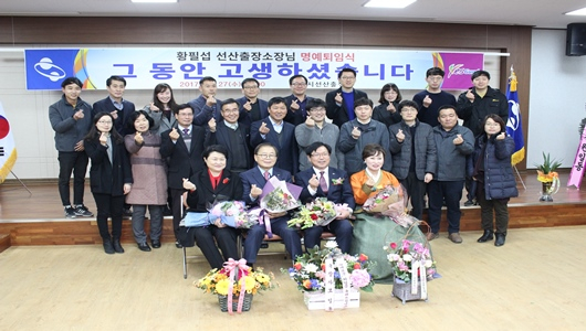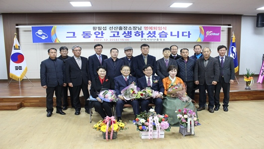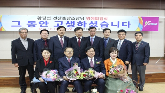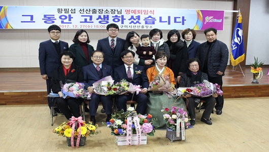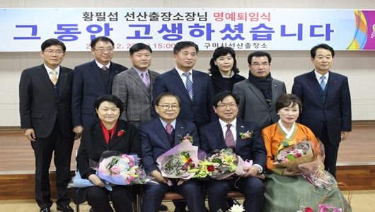 [구미=경북IT뉴스] 황필섭 선산출장소장은 12월 27일 출장소 4층 회의실에서 명예퇴임식을 갖고 40여년의 공직생활을 마무리했다. 남유진 구미시장을 비롯한 가족·친지, 시청 직원 등이 참석한 가운데 임용장·공로패 수여, 환송사, 퇴임사, 기념품 및 꽃다발 수여식 순으로 진행됐다