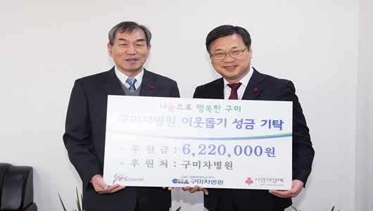 [구미=경북IT뉴스] 차의과학대학교 부속 구미차병원은 지난해 12월 27일 구미시청 부시장실에서 나눔문화 확산 ‘이웃돕기 성금’에 동참하고자 성금 622만원을 전달했다.