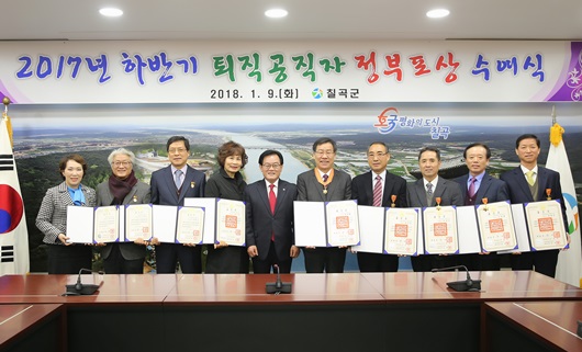 [칠곡=경북IT뉴스] 칠곡군은 지난 1월 9일 군청 제1회의실에서 백선기 칠곡군수를 비롯해 실·과장, 퇴직공직자 등이 참가한 가운데 ‘2017 하반기 퇴직공직자 정부포상 수여식’을 가졌다. 이번 포상은 일생을 지역과 국가발전을 위해 봉사해온 공직자중 흠결없이 퇴직하는 공무원들을 대상으로 선정됐다.