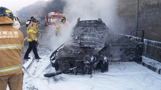 [칠곡=경북IT뉴스] 지난 1월 14일 오전 8시 38분경 칠곡군 지천면 덕산리 왜관방향 4번 국도에서 이모씨(남, 23)가 몰던 승용차가 미끄러지면서 중앙분리대와 방음벽을 잇따라 충돌 후 화재가 발생했다.