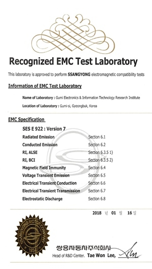 쌍용자동차의 EMC 인정 프로그램은 EMC 평가 설비를 보유한 우수한 사외 평가 기관을 선정하고 인증서를 발급해 주는 제도이다. 쌍용자동차에 차량용 전장품을 납품하기 위해서는 지정된 시험 기관에서 필수적으로 시험평가를 거쳐야 한다.
