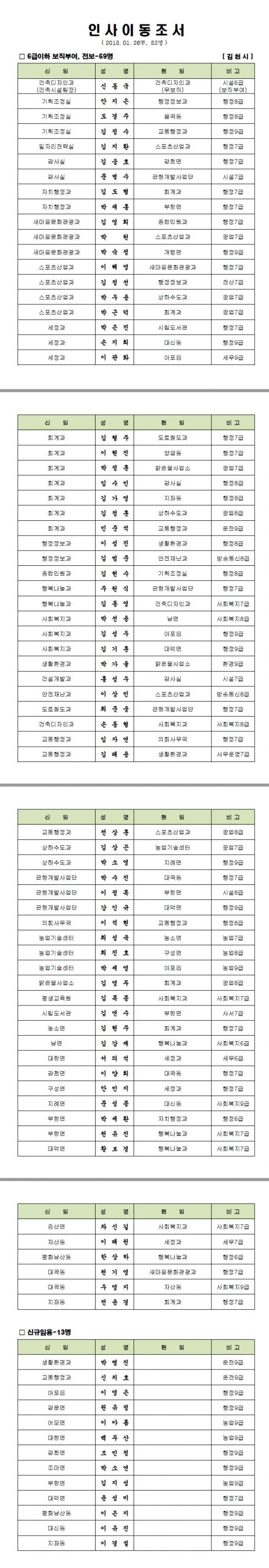 [김천=경북IT뉴스] 김천시는 1월 26일자 82명에 대한 인사이동조서를 발표했다.