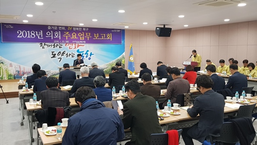 [포항=경북IT뉴스] 포항시 의회는 1월 23일 남·북구청을 방문해 2018년도 주요업무 보고를 받고 각종 시책에 대한 의문사항에 질의하고 개선사항 주문과 대안을 제시했다. 특히, 최근 대형 화재사고로 많은 경각심을 불러일으킨 소화전 부근 불법주차 문제와 소방차 길 터주기 문제, 다중이용시설 비상구 확보 문제 단속을 강력히 요청했다. 또한, 전통시장 화재예방 대책 수립과 죽도시장 주차 문제 근절을 당부, 푸드 트럭의 양성화 정책에 따른정상적인 영업장소 확보, 불법 광고물 근절을 위한 다양한 방안에 대해 물었다. 이어 도로변 녹지공간의 관리 미흡한 부분을 지적하고 농업용수 확보 대책도 수립할 것을 주문했다.