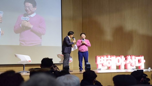 무대 구성도 ‘변해야 산다’는 조형물 하나와 의자 세 개만 놓고 빔프로젝터와 스크린을 이용하는 등 소박하고 젊은 감각으로 꾸몄다. 밝은 분홍색의 스웨터 등 편안한 캐주얼 복장으로 등장한 이 의원은 특유의 소탈한 화법으로 ‘인생 스토리’를 늘어놓았다.