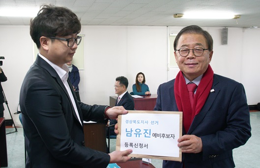 남유진 예비후보는 2월 13일 경북선관위를 찾아 자유한국당 경북도지사 출마자로서 첫 예비후보로 등록했다. 남 예비후보는 “경제도지사, 일자리도지사, 문화도지사가 되어 경북도 전체를 균형 발전시키겠다.”면서 “앞으로 120일 동안 300만 경북 도민의 밥이, 저 남유진의 하늘이라 생각하고 모든 열정을 쏟겠다.”고 말했다.