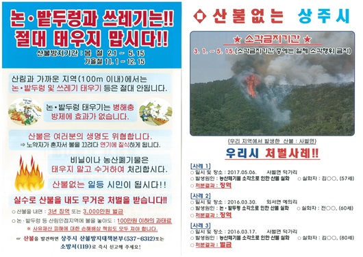 제작한 홍보 전단에는 산림과 100미터 이내에서 논·밭두렁 및 쓰레기를 절대 태우지 말 것과 실수로 산불을 낼 경우도 3년 이하의 징역 또는 3천만원 이하의 벌금을 물게 된다는 점 등의 처벌 사례가 담겨 있다.