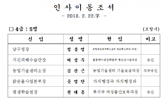 [포항=경북IT뉴스] 포항시는 2월 22일자 4급 승진자 5명을 발표했다.