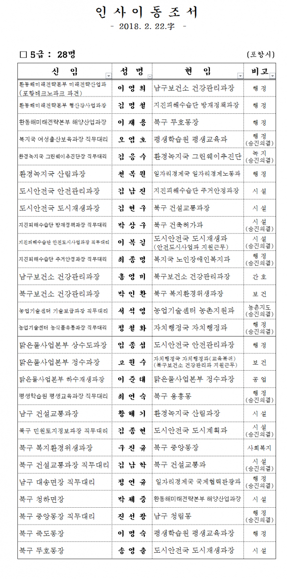 포항시 5급 인사이동 단행