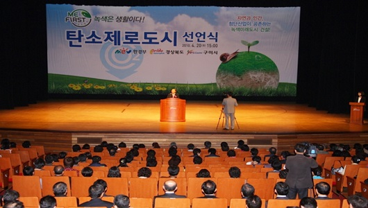 [구미=경북IT뉴스] 구미시는 기후변화에 선제적이고 종합적으로 대응하기 위해 2008년 10월 2일 기후변화 선도도시 출범에 이어 전국 기초자치단체 최초로 2010년 4월 20일 ‘탄소제로도시’를 선포했다. 탄소제로도시란, 온실가스 배출을 줄임과 동시에 배출된 온실가스를 흡수할 수 있는 탄소흡수원 조성으로 도시 내 온실가스의 총합이 제로가 되는 도시이다.