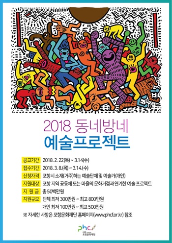 [포항=경북IT뉴스] (재)포항문화재단은 예술가 및 예술단체를 지원해 기초예술분야 자생력을 강화하고, 시민과 예술로 소통하는 지역공동체를 만들고자 ‘2018 동네방네 예술프로젝트 지원사업’을 진행한다.