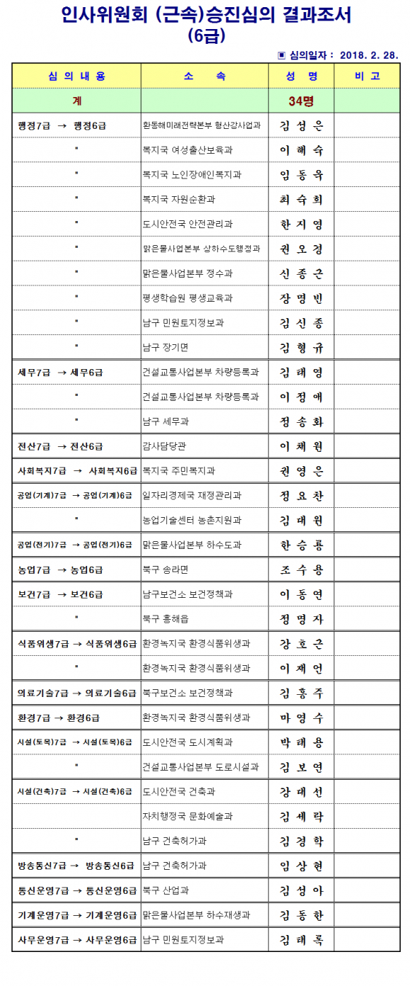 [포항=경북IT뉴스] 포항시는 2월 28일자 6급 승진인사 34명에 대한 승진심의 결과조서를 발표했다.
