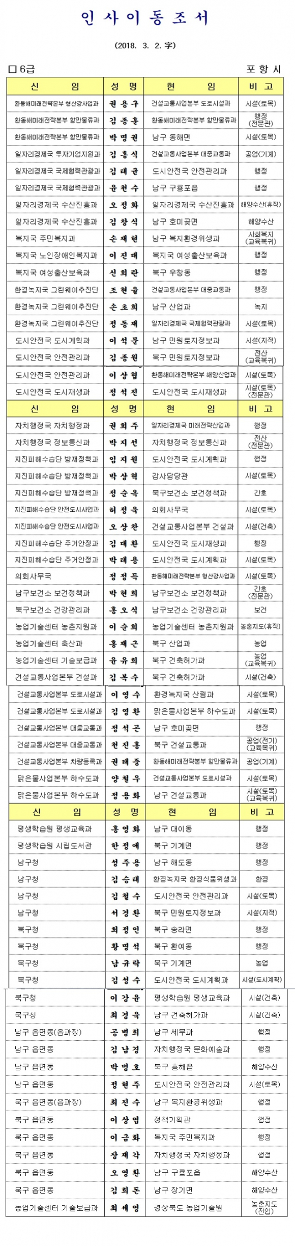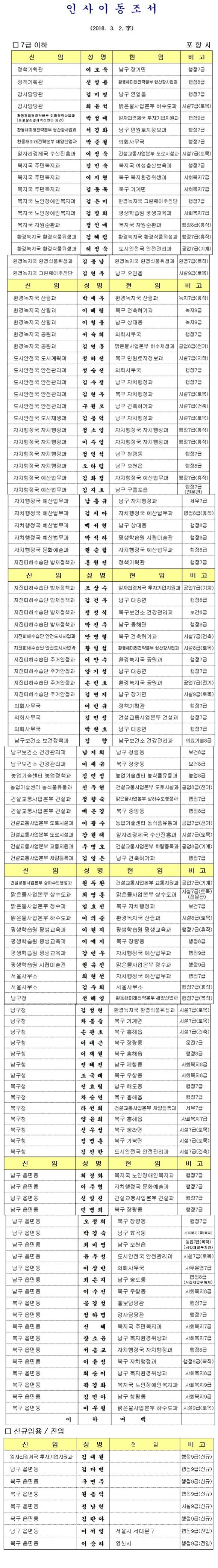 포항시 6급이하 인사이동조서