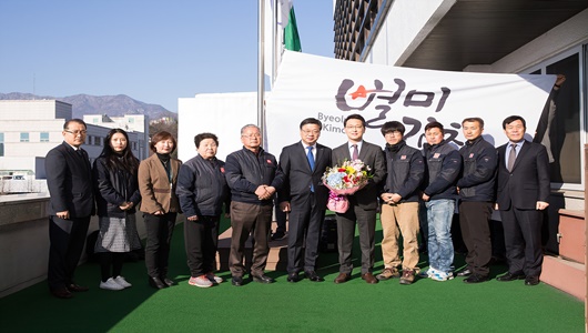 108번째 이달의 기업으로 선정된 구미협동식품은 3월 2일 구미시청 국기게양대 앞에서 이묵 부시장과 문동환 대표 및 임직원 등 40여명이 참석한 가운데 회사기(會社旗) 게양식을 가졌다.