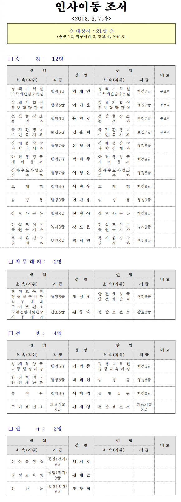 대상자는 총21명(승진12, 직무대리2, 전보4, 신규3)이다.