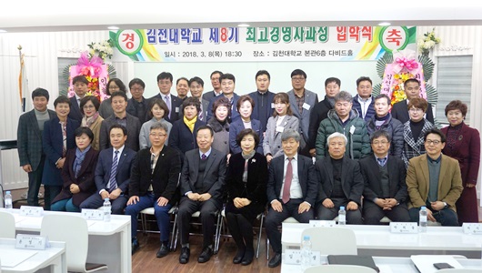 [김천=경북IT뉴스] 김천대학교 대학원은 3월 8일 대학본관 6층 다비드홀에서 김홍길 대학원 주임교수, 8기 입학생 17명, 박희룡 대학원장, 임원진들이 참석한 가운데 최고경영자과정 제8기 입학식을 개최했다고 밝혔다.