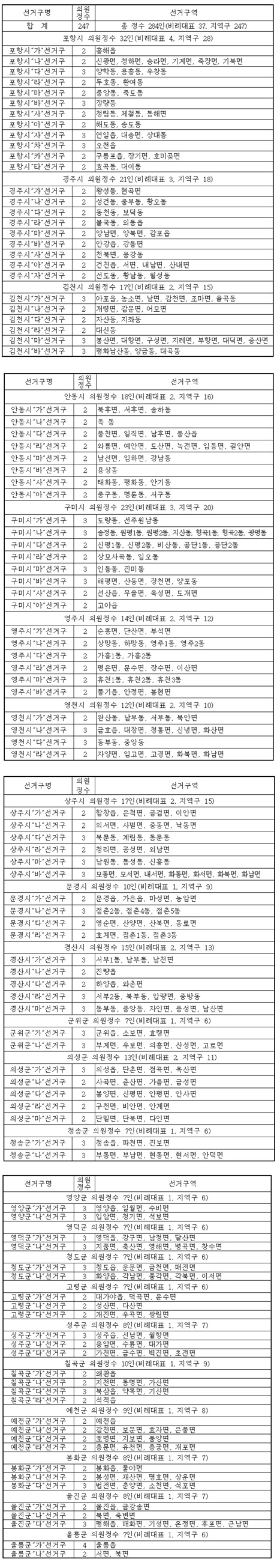 포항시의 환여동, 중앙동, 죽도동, 동해면 등과 경주시의 불국동, 건천읍, 서면 등과 고령군의 개진면, 우곡면 등은 선거구와 선거구별 의원정수가 함께 조정됐다.