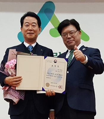 | 우진석 구미시산림조합장 (좌) | [구미=경북IT뉴스] 우진석 구미시산림조합장은 지난 2월 22일 산림조합중앙회에서 개최된 2018년 정기총회에서 산림사업 유공자부문 수상자로 선정, 농림축산식품부 장관표창을 수상했다.