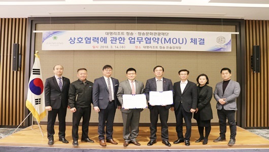 [청송=경북IT뉴스] 청송문화관광재단과 대명리조트청송이 3월 14일 대명리조트청송 든솔 강의실에서 청송의 문화·관광·레저산업 발전을 위한 업무협약(MOU)을 체결했다고 밝혔다.