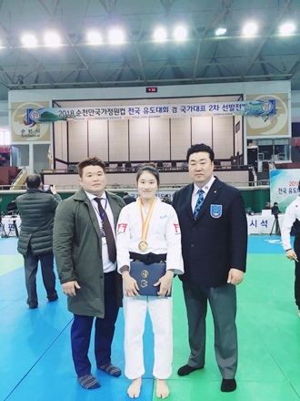 왼쪽부터 이종호 포항시청 유도팀 코치, 김잔디 선수, 전광수 감독