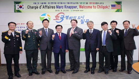 [칠곡=경북IT뉴스] 칠곡군은 3월 21일 마크 내퍼 주한미국대사대리가 칠곡군을 방문했다고 밝혔다. 백선기 칠곡군수를 비롯해 칠곡군 기관장 등은 군수실에서 마크 내퍼 대사대리와 환담의 시간을 가졌다.