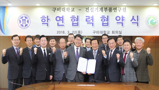 [구미=경북IT뉴스] 구미대학교는 3월 22일 본관 3층 회의실에서 정창주 총장과 윤종구 건설기계부품연구원장을 비롯해 양측 실무 관계자와 특수건설기계과 교수, 학생 등 40여 명이 참석한 가운데 산업통상자원부 산하 연구기관인 건설기계부품연구원과 학·연 협약(MOU)를 체결했다고 밝혔다.