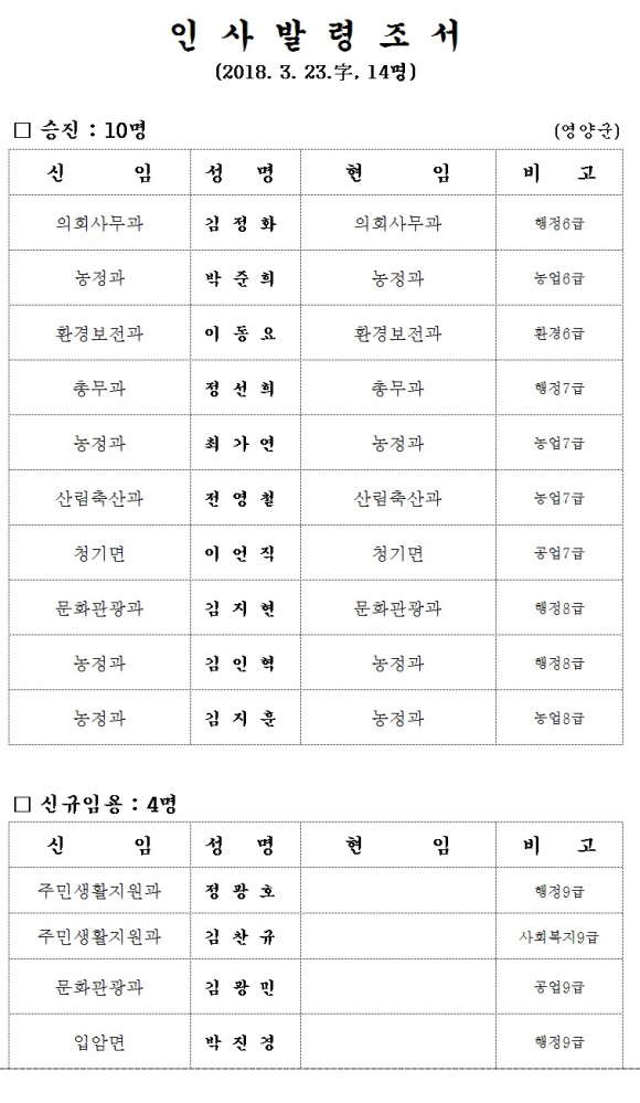 영양군 인사이동조서 발표