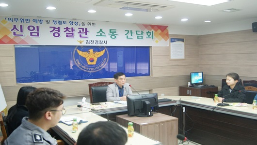 [김천=경북IT뉴스] 김천경찰서는 3월 26일 경찰서 열린방에서 청문감사관 주재로 신임 경찰관 37명이 참석한 가운데 행복동행이라는 주제로 간담회를 개최했다.