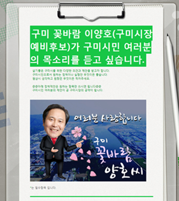 이 예비후보는 “43만 구미시민의 제안이 곧 이양호의 공약”이라며 구미시민으로서 느꼈던 필요 정책들을 SNS공식 계정에 링크된 양식을 통해 익명으로 누구든지, 어떤 의견이라도 작성해 제출하면 공약에 적극 반영하겠다는 방침이다.