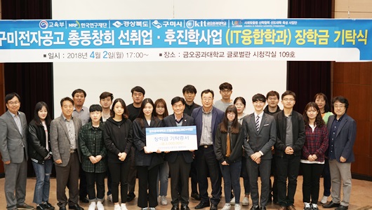 4월 2일 글로벌관 시청각실에서 열린 장학금 기탁식은 구미전자공고를 졸업하고 금오공대 IT융합학과에 입학한 학생들을 위해 마련됐다. 구미전자공고 총동창회는 산업체 재직자 전형의 IT융합학과 신·편입생들에게 매년 3백만 원의 장학금을 4년째 후원하고 있다. 올해는 신입생 8명과 편입생 2명 등 총 10명에게 장학금을 전달했다.