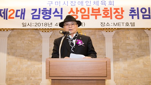 [구미=경북IT뉴스] 구미시장애인체육회(회장 구미시장 권한대행 이묵)는 4월 5일 메트로호텔에서 장애인체육관계자와 장애인단체장, 유관단체장 등 150여명이 참석한 가운데 신임 김형식 구미시 장애인체육회 상임부회장 취임식을 가졌다.