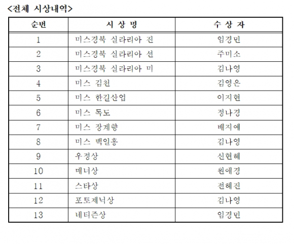 한국일보·대구한국일보가 주최·주관하고, 경상북도와 김천시가 후원한 이번 대회에서 임경민씨가 미스경북 실라리안 진(眞)의 왕관을 차지했으며, 미스경북 실라리안 선의 영예는 주미소, 미스경북 실라리안 미는 김나영씨가 각각 차지했다. 이들 3명은 오는 7월 4일 서울 올림픽공원에서 열리는 ‘2018 미스코리아 선발대회’에 경북대표로 출전하게 된다.