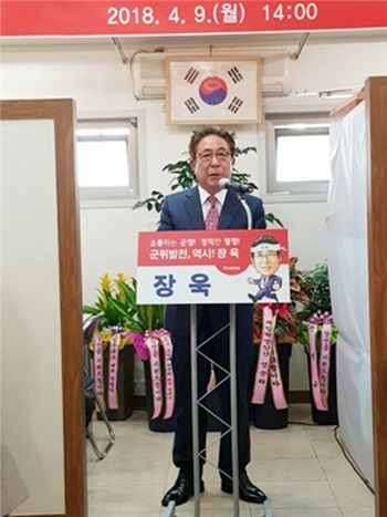 [군위=경북IT뉴스] 군위군수에 출마한 장욱(64·자유한국당) 예비후보가 4월 9일 군위읍 중앙길 98 (이광렬 치과 1층)에서 군민들과 함께 예비후보 선거사무소 개소식을 열었다.