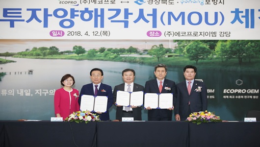 이날 에코프로지이엠 공장에서 김관용 경북도지사와 이강덕 포항시장, 이동채 에코프로 회장 등이 참석한 가운데 에코프로와 리튬이차전지 양극재 생산 공장 신설을 위한 대규모 투자유치 관련 양해각서(MOU)가 체결했다.