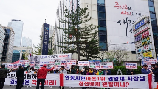 권 시장 지지자 200여 명은 13일 서울 자유한국당 당사를 찾아 안동시장 공천심사 결과에 대해 강력히 반발했다. 이들은 공천을 받아들일 수 없다는 이의신청서를 제출하고 당사 앞에서 한국당을 비판했다. 지지자들은 “지역민심을 전혀 반영하지 않은 공천”이라고 밝혔다.