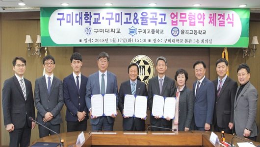 [구미=경북IT뉴스] 구미대학교는 4월 17일 정창주 총장과 마해수 구미고 교장, 송규흠 율곡고 교장을 비롯 양측 관계자 10여 명이 참석한 가운데 본관 3층 회의실에서 구미고등학교, 김천 율곡고등학교와 상호 발전을 위한 업무협약을 체결했다고 밝혔다.