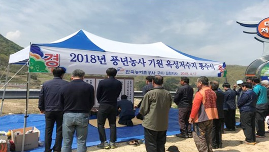 [구미=경북IT뉴스] 한국농어촌공사 구미·김천지사(지사장 권성군)는 4월 17일 본격적인 영농기를 맞이해 구미시 옥성면 대원리 소재 대원저수지에서 2018년 풍년과 안전을 기원하는 통수식을 가졌다. 이날 행사는 지사운영대의원, 시설물관리인, 지역농업인 등 80여명이 참석한 가운데 올해 농사의 풍년을 함께 기원하고, 지역발전에 노력을 다하고자 마련했다.