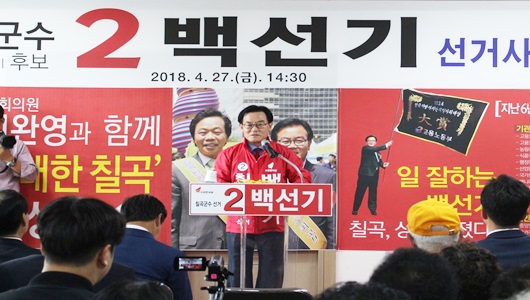 백 후보는 공약으로 칠곡시 승격, 대구 광역철도 북삼역 신설,양질의 일자리 2만개 창출, 사회적 약자에게 힘이 되는 희망복지, 강소농 억대농가 육성 등을 제시했다.