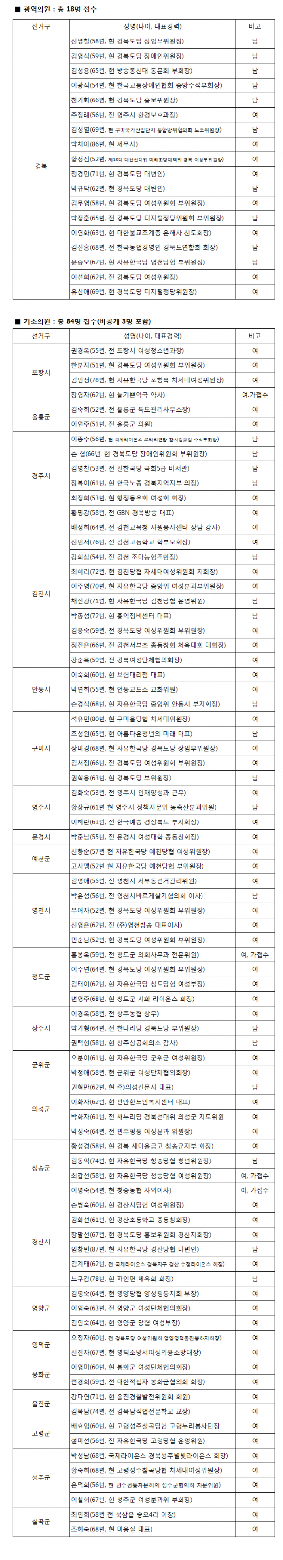[경북=경북IT뉴스] 자유한국당 경북도당은 4월 30일 ‘제7회 전국동시지방선거’ 자유한국당 경북 비례대표 후보 공천접수 결과를 발표했다. 광역의원 총18명, 기초의원 총84명이다.