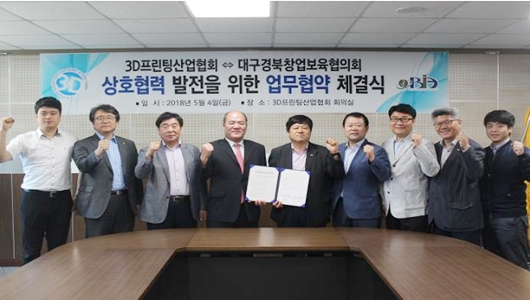 [구미=경북IT뉴스] 3D프린팅산업협회(회장 김한수)는 지난 5월 4일 대구경북창업보육협의회(회장 정치영)와 3D프린팅산업 분야의 중소벤처기업 경쟁력 강화를 위한 업무협약을 체결했다고 밝혔다.