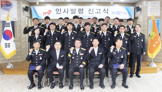 [칠곡=경북IT뉴스] 칠곡소방서는 5월 8일 2층 대회의실에서 승진자와 전입·전보자의 신고식을 열었다. 이번 인사발령자 37명은 각 행정부서 및 현장대응단, 119안전센터로 배치되어 행정업무 및 화재진압·구조·구급 등을 통해 소방 최일선에서 칠곡군민의 안전지킴이 역할을 수행하게 된다.